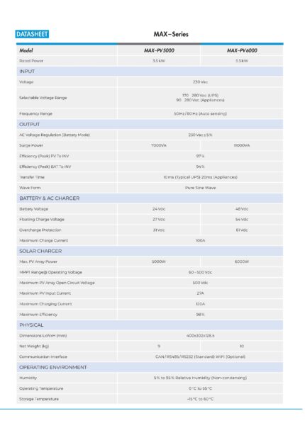 DJDC MAX Series 3.5kW Hybrid Solar Inverters (PV 5000) are high-efficiency, pure sine wave inverters designed for residential and small commercial solar systems. They support battery and battery-less operation, feature a wide PV input range, built-in MPPT solar charger, and offer smart power management with grid, solar, and generator compatibility. With optional WiFi monitoring and BMS communication, these inverters ensure reliable, stable, and intelligent energy solutions.